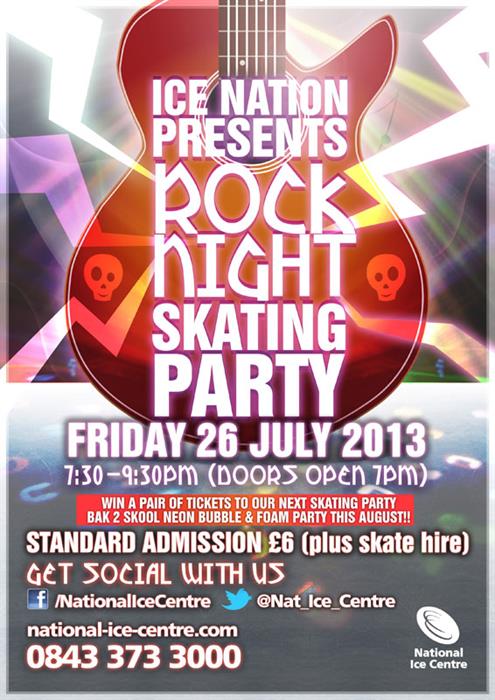 Tickets for the Rock Night Skating Party are on sale now, priced at £6 per person (plus skate hire). The party starts at 7:30pm (doors 7pm) and will finish at 9:30pm.