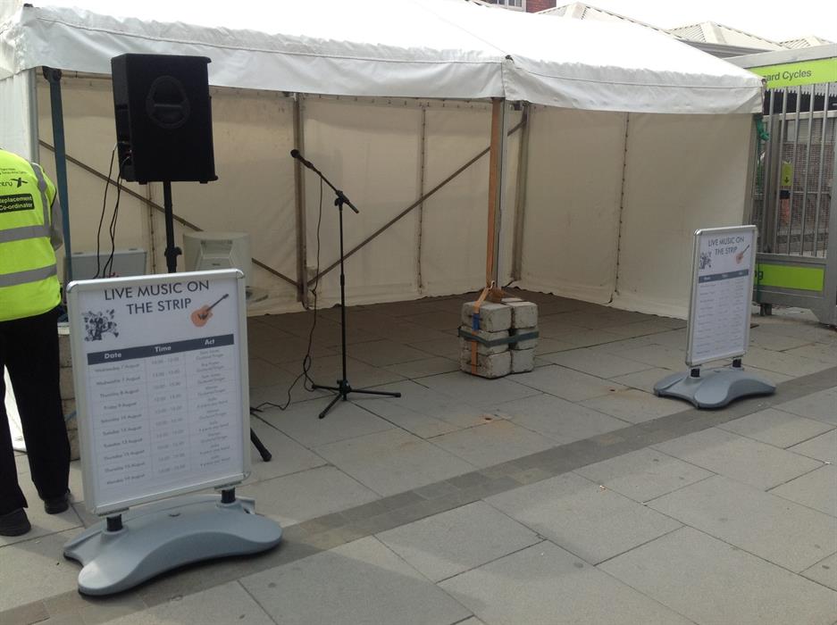 As many of you are aware, Nottingham Station is undergoing a multi-million pound refurbishment. The end result will see Nottingham become the central hub of rail travel in the region with more platforms as well as extensions to its current platforms, and a new state of the art signal system. In terms of the aesthetics, modernisation of the existing interior and exterior will make way for new cafe’s and shops plus a clean look and feel to a building with plenty of history. I paid a visit to the Station on Thursday 8th August to see for myself how the work is progressing and to gain a perspective on what the end result will offer Nottingham commuters. Upon arrival, it was clear to see that the staff at the station are putting a real emphasis on maintaining a positive atmosphere around the site, with live entertainment on what is now named ‘The Strip’. Musicians are given the chance to perform on a mini stage set up on Station Street to entertain passengers waiting for replacement buses. The Station manager, Darren Field-Thomas, also informed me that this week they will be handing out cricket ball style macaroons to passengers to maintain the positive mood. There was a real vibe when I arrived, something that is normally hard to create on building sites. I was even