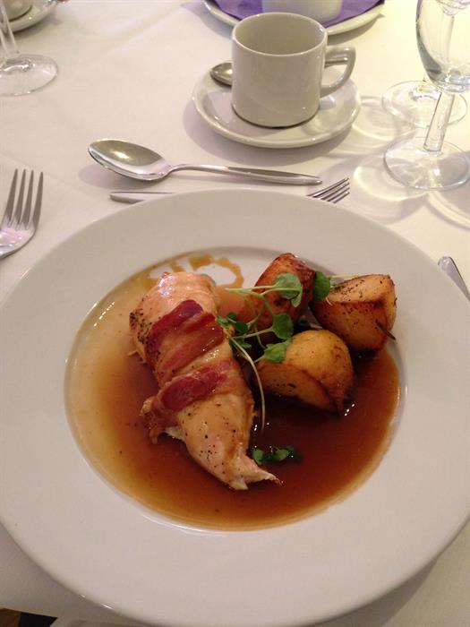 atmosphere. The decor is clean and crisp but maintains original period features. It's a perfect mix of old and new. The Kitchen Garden Restaurant, situated at the rear of the hotel, is one of the most recent additions to the building and is lined with glass patio doors, maximizing the natural light. Chandeliers hang from the ceiling and a small bar makes this room ideal for corporate lunches, weddings or parties. The food is top notch too. Our two course lunch was beautifully presented and it's safe to say that everyone sat around our table thoroughly enjoyed it. I tried the chicken wrapped in bacon with roast potatoes and gravy with a side of vegetables. It was just what the doctor ordered on a cold February afternoon.