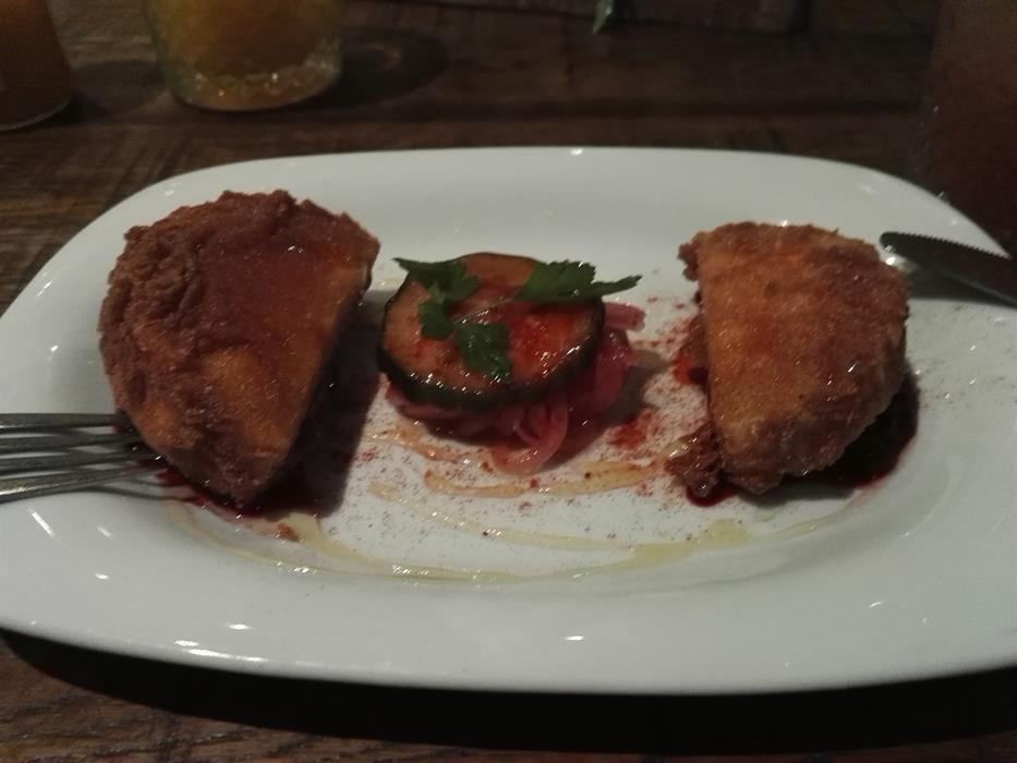 We decided to try some starters first and then go for the main course. I went for Goat’s Cheese Fritters to start. They were two goat’s cheese slices coated in smoked paprika batter, served with George’s house pickles, beetroot chutney, and parsley salad – all that drizzled with honey and sprinkled with paprika, yummy! I really enjoyed the starter and was looking forward to my main course. For my this I went for the traditional wild ocean cod served with twice cooked chips, mushy peas, chunky tartar sauce and a few pickles. When the main course arrived, I was really impressed with the size of the cod, it was massive! It was in this moment that I knew I wasn't going home hungry. The chips looked really good as well, they were nice and chunky. The cod was one of the best I’ve ever had and even though it was massive I nearly finished it all - the power of tasty cod is impressive. I couldn’t make any more space for the dessert though, but if I did I bet it would have been as delicious as both the started and the main course.