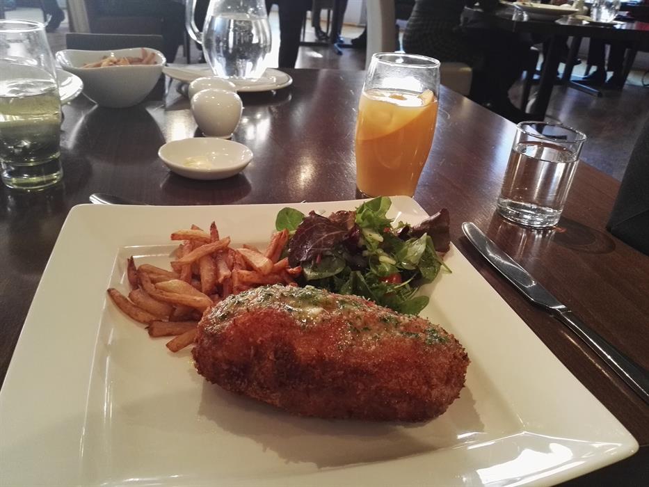 We both decided to go for a two course meal. I went for seasonal soup served with homemade bread and salted butter for my starter which turned out to be really creamy and delicious. It was little sweet and had a hint of cream and parsley on top. Second course was an easy choice from me, I went for chicken dish - panko crust Kiev with herb butter melted on top, french fries and mixed salad. It did not disappoint, the portion was very generous and deliciously wrapped in the herb butter with a dominating taste of garlic - which was a clear winner for me, I love garlic.