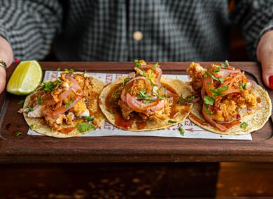 Hot-honey fried chicken tacos and a smoky pork butt quesadilla, served with gumbo-loaded tater tots topped with jalapeños and scallions.