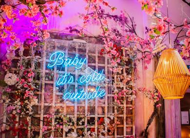 The top floor is the photo-worthy Electric Garden, fitted with it’s own neon blossom tree. The perfect spot for a curated gin and tonics. This can be hired private Sunday-Thursday too.