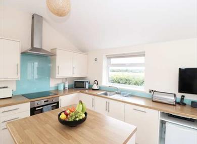 The open plan living space provides a relaxing and comfortable dining area, sitting room and kitchen fitted with an excellent range of kitchen equipment, fridge / freezer, oven, hob, dishwasher and Microwave oven. A kitchen table and four chairs are sited next to patio doors overlooking farmland to provide semi-outdoor dining, or move out onto the patio area with garden furniture for the full alfresco dining experience.