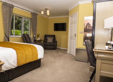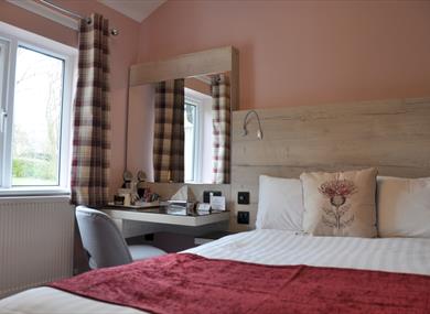 The building’s centre originally comprised two late 18th-century farm cottages, which now house five first-floor single rooms and the ground-floor breakfast room. The west wing was added in 2005, providing four spacious deluxe king rooms, available for double, twin, and family occupancy. Two of these rooms are located on the ground floor, with one featuring a walk-in wet room bathroom designed for guests with restricted mobility and wheelchair users.