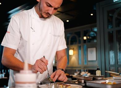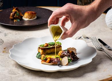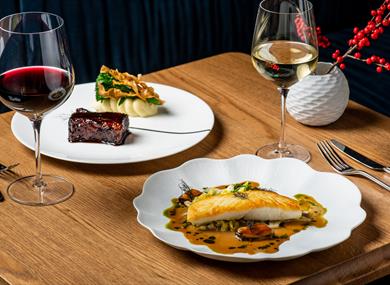 On the Sunday menu, you can expect the very best British roasted meats served with duck fat roast potatoes, seasonal vegetables, and homemade Yorkshire puddings. Sirloin of beef, rolled crisp pork belly and beef Wellington are on the Sunday lunch set menu offering two courses for £35 or three courses for £45.