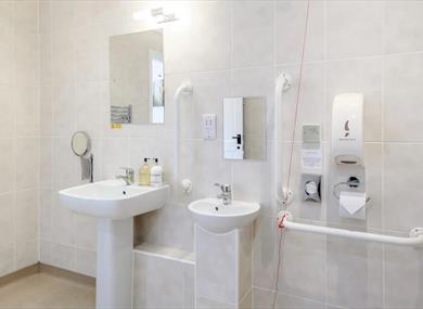 The spacious wet room provides an excellent space for getting ready, equipped with convenient handrails throughout for added support.