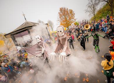 The Strolling Bones Parade will also be providing some hair-raising fun. This eerie yet playful walkabout performance, created by Walk the Plank, features lively skeleton puppets dancing to the infectious sounds of the Fat Cat Brass Band.