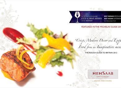 Winners of the Nottingham Post Best Indian Restaurant 2013 Overall City and County Award, Best Restaurant Runner-up in the Observer Food Monthly Awards 2011, 2012 and 2013 and recommended in the Michelin and Hardens Guides 2014, MemSaab continues to raise the standard of Indian fine dining whilst remaining accessible, affordable and most importantly enjoyable. Comfortably and stylishly designed, seating up to 200 with two private rooms. With it's Award winning chefs, extensive menu and impeccable service, MemSaab is the perfect host for A La Carte, private and corporate dining. The interior design combining traditional Indian craftsmanship and modern Indian art captures the essence of India whilst placing MemSaab firmly in the 21st century!