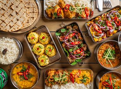 Nestled on Stoney Street, Mowgli sits pretty in a whimsical pink facade, charming in its color and vibrancy. Inside, an ornate staircase leads you to a world where food is a celebration, and you're immediately swept into Chat Bomb heaven, where the sizzle and crunch of street snacks meets the artistry of contemporary cooking. Mowgli’s Nottingham home is cool, restrained, and effortlessly bohemian, with a modern yet traditional feel that invites you to relax and enjoy the sensory overload of colors, aromas, and textures. It perfectly captures the essence of India's street food culture, offering a warm, inviting atmosphere where every bite tells a story.