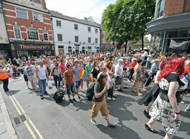 The day will begin with a visibility march through the city centre of more than 7,000 LGBTQ+ people and allies, starting at Listergate at 12pm (meet from 11am) and finishing at Sneinton Market.