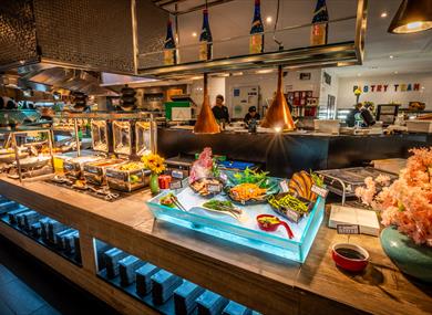 Drawing inspiration from Eastern philosophy, it is believed that everything at Panda Mami is interconnected. The talented chefs craft a daily feast of more than 250 authentic dishes, representing a global culinary tapestry. Their extensive menu spans the culinary spectrum, encompassing Chinese, Indian, Japanese, Italian, Spanish, Carving Roast, Vegan, Vegetarian, and a sumptuous array of desserts.