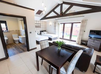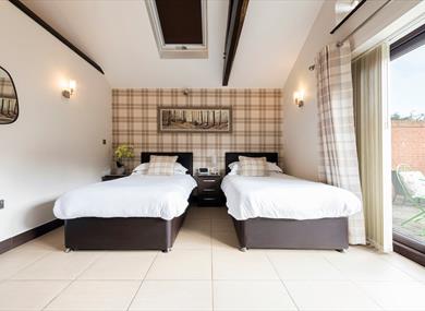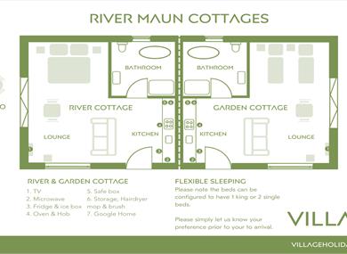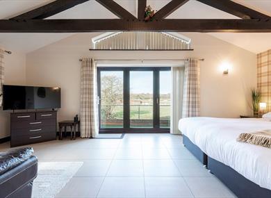 Each cottage has bi-folding patio doors that open onto a private seating area within the garden, with stunning rural views over the River Maun and the fields beyond, the garden boasts an artificial lawn meaning it can be enjoyed all-year round, whatever the season. We offer flexible sleeping arrangements with the option of one king-size or 2 single beds.