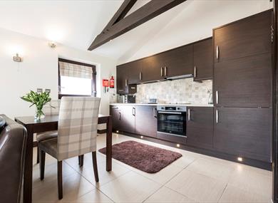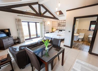 These self-contained cottages were designed and built in 2014 to complement the 17th century farmhouse. With dark wooden beams, an open plan living and dining area, stylish and fully equipped kitchen, and en-suite bathroom with a walk-in shower and freestanding rolltop bath, these self-catering holiday lets are small but perfectly formed!