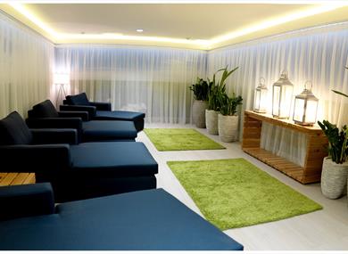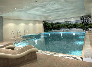 Throughout the two floors of the spa, the stylish walls, modern styling, and relaxing colour tones help clients escape the hustle and bustle of everyday life. Bringing the outdoors inside, the wall to wall mural of the sea overlooking the pool stands in contrast to the dark walls that surround it. The fully-equipped gymnasium also adopts the mural concept with bespoke designed artwork.