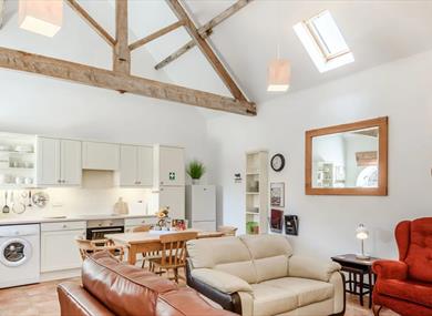 As you make your way inside up the convenient ramp, you'll immediately be captivated by the bright and inviting open-plan living space, adorned with original barn features and boasting cosy underfloor heating.