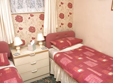 The bedroom has two single beds, a bedside cabinet, double wardrobe and a chest of drawers and overlooks the garden.