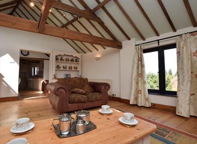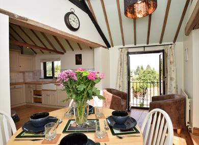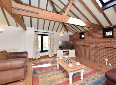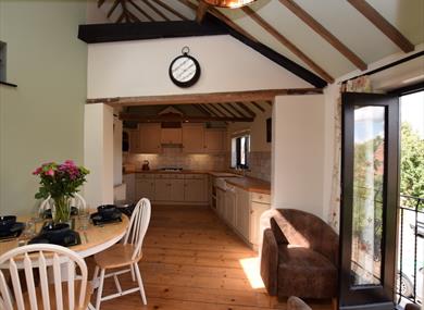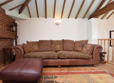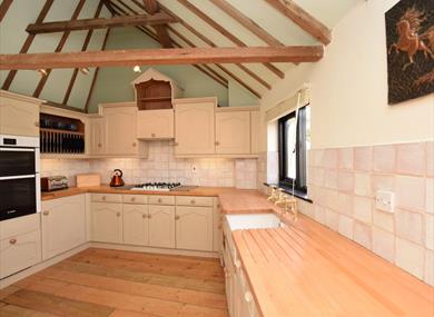Moving up to the first floor and the top of the stairs which lead into a fabulous lounge packed full of features, including exposed beams and brickwork, as well as two generous skylights which let plenty of natural light flood into the room. The lounge area has an ample amount of comfortable seating, along with a TV and DVD player. Heading through the archway and you will come to the kitchen/diner where you’ll find a good size farmhouse dining table ideal of serving up delicious meals. The kitchen has plenty of features, including a gas hob and electric oven, dishwasher, fridge and freezer.