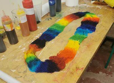 You'll get a 100g skein and three 20g skeins on the day, ready prepared for you to dye yourself with our many, many colours. The yarn is a merino/nylon blend, a 4ply sock yarn*, the yarn has to be protein based for the dye we use. I'll talk you through techniques and things to think about but it's not a formal lesson so prepare to experiment. It's a messy workshop so wear messy clothes! There won't be enough time to dry the yarn so bring a plastic bag with you to take it home.